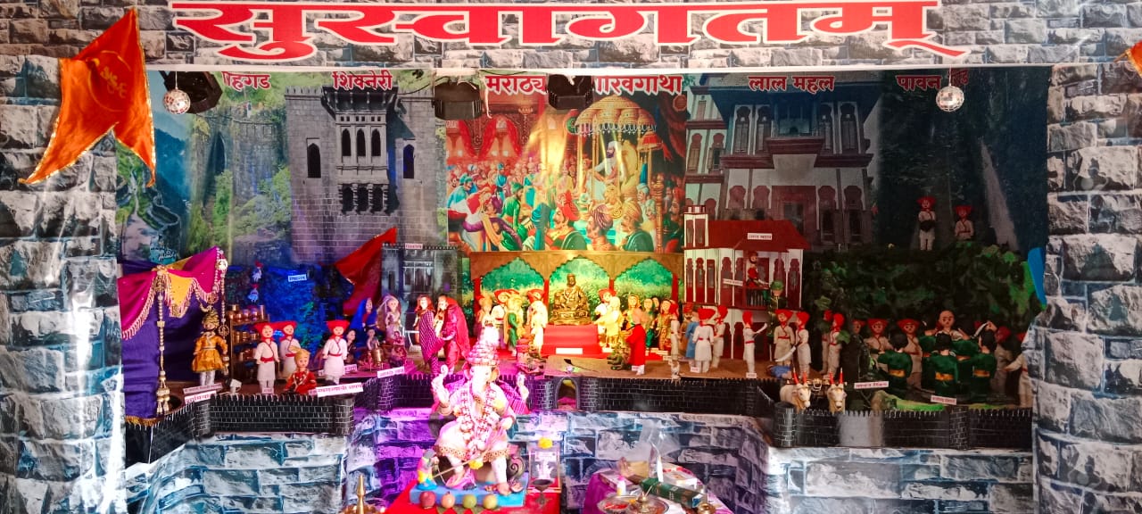 वडगाव मावळ :- प्रवीण देशमुख निर्मित/लिखित/दिग्दर्शित आशिया खंडातील नामांकित महानाट्य “मराठ्यांची गौरवगाथा” या महानाट्यातून प्रेरणा घेऊन कुसगाव (लोणावळा) येथील शिवप्रेमी लक्ष्मण नामदेव केदारी यांनी त्यांच्या घरगुती गणपतीला हालता देखावा सादर केला आहे.