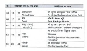 भाजपच्या दुसऱ्या यादीत महाराष्ट्रातील 20, कर्नाटकमधील 26, मध्य प्रदेशातील 5, गुजरातमधील 7, तेलंगणा आणि हरियाणातील प्रत्येकी 6, दिल्ली, हिमाचल प्रदेश आणि उत्तराखंडमधील प्रत्येकी 2, दादरा-नगर हवेली आणि त्रिपुरातील प्रत्येकी 1 जागेसाठी उमेदवार जाहीर केले आहेत. दुसऱ्या यादीत एकूण 72 उमेजवारांची नावे आहेत.