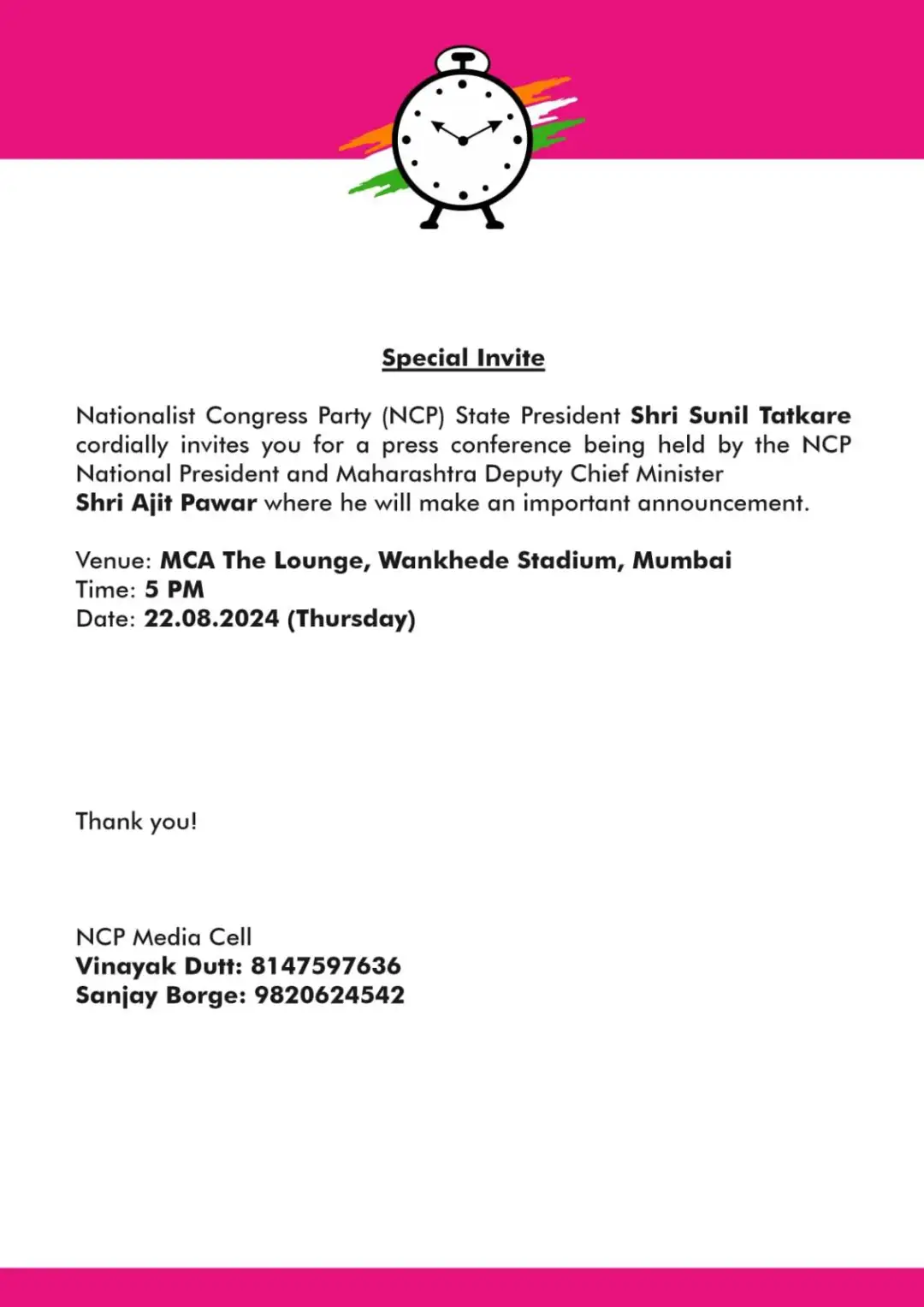 एमसीएच्या वानखेडे लाँच येथे उद्या ही पत्रकार परिषद होणार आहे. उपमुख्यमंत्री अजित पवार हे त्यांच्या तापट स्वभावामुळे ओळखले जातात. विधानसभेच्या 2019 च्या निवडणुकीनंतर महाविकास आघाडीचं सरकार स्थापनेसाठी जवळपास संपूर्ण हालचाली पूर्ण झाल्या होत्या. ज्या दिवशी शिवसेना, राष्ट्रवादी काँग्रेस आणि काँग्रेस हे सरकार स्थापनेचा दावा करण्यासाठी राज्यपालांकडे जाणार होते त्याचदिवशी पहाटे अजित पवार यांनी भाजपसोबत पहाटेचा शपथविधी उरकला होता. पण हे सरकार 36 तासांच्या आत कोसळलं होतं. हेही असे की थोडे अजित पवार यांनी वर्षभरापूर्वी अचानक तडकाफडकी महायुतीत जाण्याचा निर्णय घेतला. त्यांच्या बंडामुळे राष्ट्रवादी काँग्रेस पक्षात फूट पडली. पण आता महायुतीत काही ठिकाणी विधानसभेच्या जागावाटपाच्या पार्श्वभूमीवर खटके उडताना दिसत आहेत. या सर्व घडामोडी पाहता अजित पवार यांनी अचानक उद्या बोलावलेल्या पत्रकार परिषदेतेला जास्त महत्त्व प्राप्त झालं आहे.